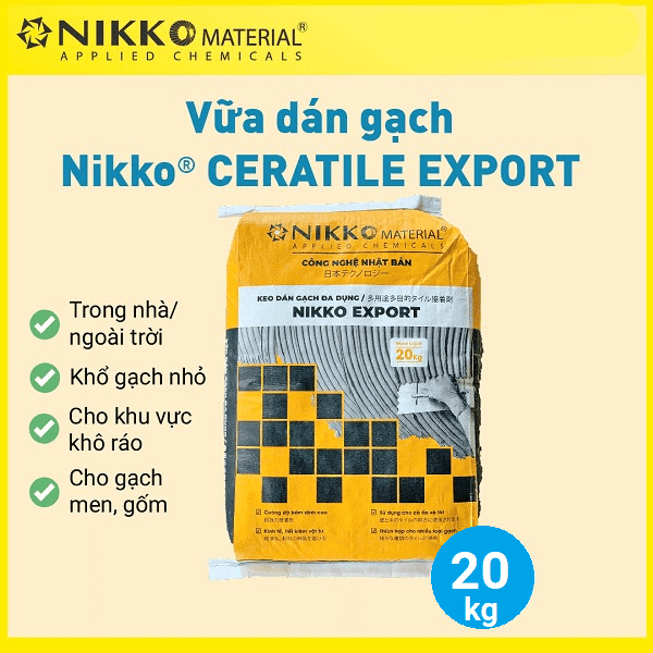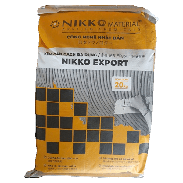 - Keo dán gạch Nikko Export là dòng keo dán gạch đa dụng được sản xuất từ xi măng đặc chủng, silicat chọn lọc, polymer và một số phụ gia tăng tính thi công, đạt chuẩn TCVN 7899-2:2008, thuộc nhóm C1 và là keo dán gạch gốc xi măng.